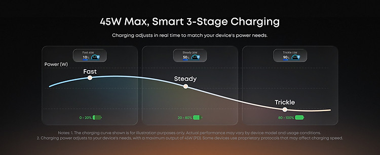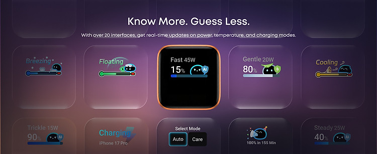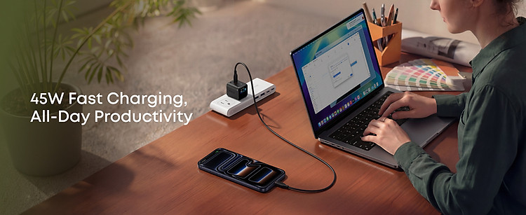 Công suất 45W – sạc nhanh iPhone, iPad, MacBook Air Màn hình LED thông minh – hiển thị công suất & trạng thái sạc Tự nhận diện thiết bị (AI Power)️ Care Mode bảo vệ pin – giảm nhiệt khi sạc ...