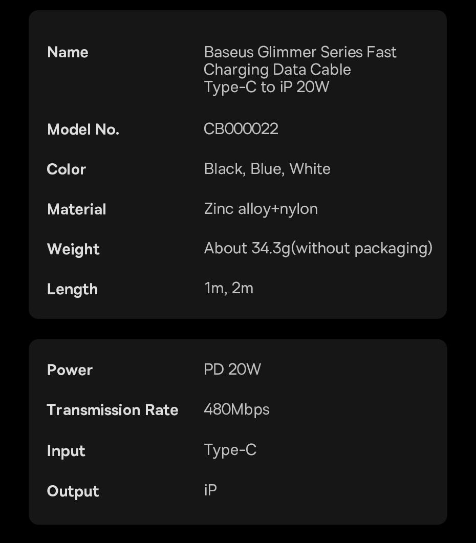 | Model | Baseus Glimmer Series Fast Charging Data Cable Type-C to iP 20W |