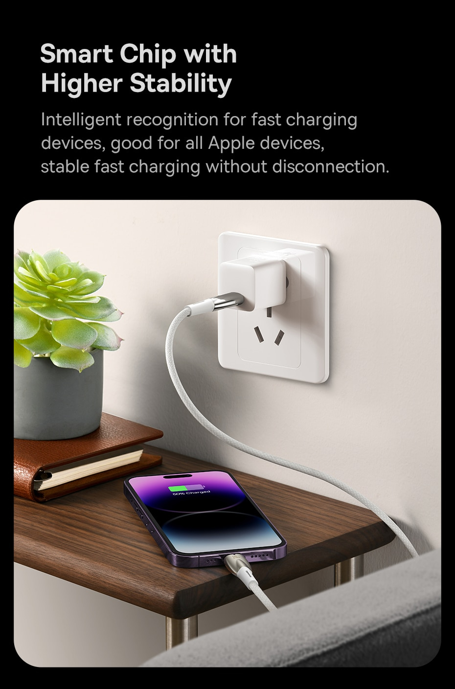 Sản phẩm được trang bị chip xử lý nguồn thế hệ mới nhất hỗ trợ sac nhanh PD 20W, 50% pin trong 30 phút tương thích với hầu hết các thiết bị Apple chuẩn lightinng hiện nay. Tốc độ sạc được điều chỉnh phù hợp với thiết bị và từng giai đoạn sạc và dung lương pin của thiết bị, đảm bảo an toàn, không gây quá nhiệt, chai pin, phù pin.