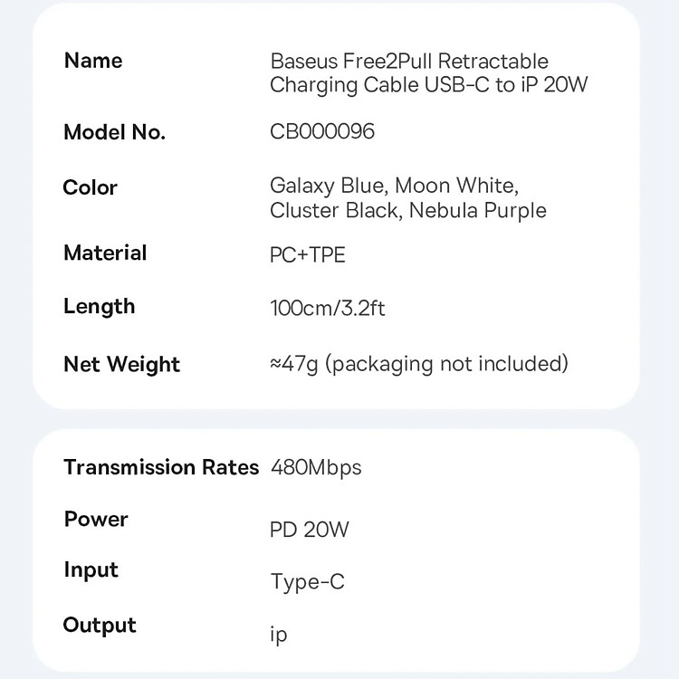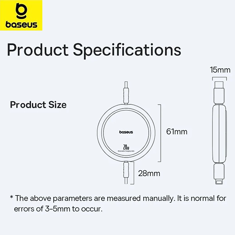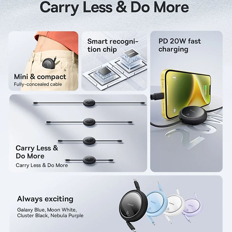 - Cáp sạc nhanh Type C to Light-ning Dây Rút 20W Baseus Free2Pull Retractable Charging Cable là giải pháp hoàn hảo, tiện lợi và đáng tin cậy cho nhu cầu sạc và truyền dữ liệu của bạn. Được thiết kế với độ bền cao và hiệu suất tối ưu, cáp này không chỉ mang lại tốc độ truyền dữ liệu nhanh chóng mà còn đảm bảo an toàn cho thiết bị của bạn. Với thiết kế rút gọn và tiện dụng, bạn có thể dễ dàng mang theo cáp này trong túi xách, balo hay túi quần áo khi đi du lịch hoặc trong các buổi làm việc.