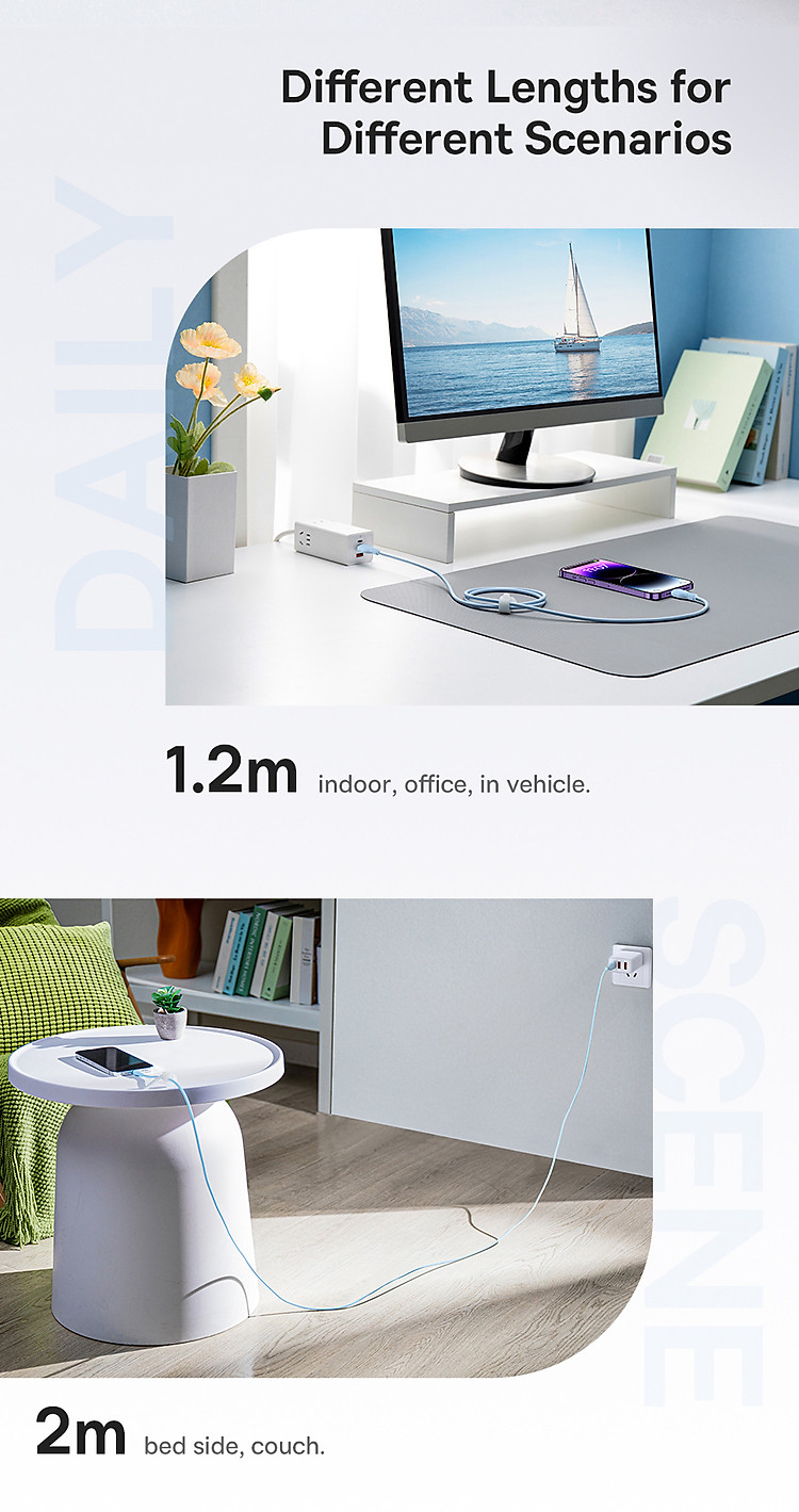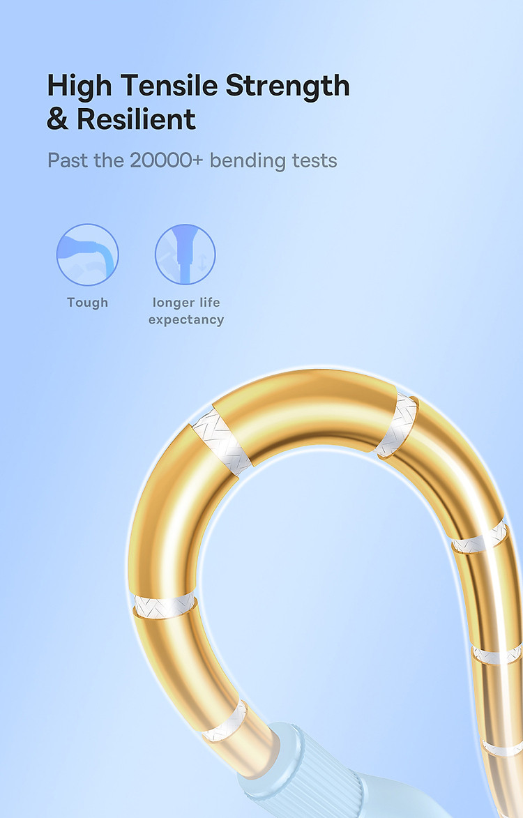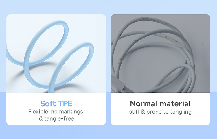Sản phẩm được làm bằng chất liệu TPE (Thermoplastic Elastomer) để tăng tính linh hoạt và độ bền của sản phẩm. TPE là một loại chất liệu có tính chất dẻo và đàn hồi cao, giúp sản phẩm có thể uốn cong, xoắn và gập ngang dọc lên đến 20000 lần mà không làm gãy hoặc rối dây.