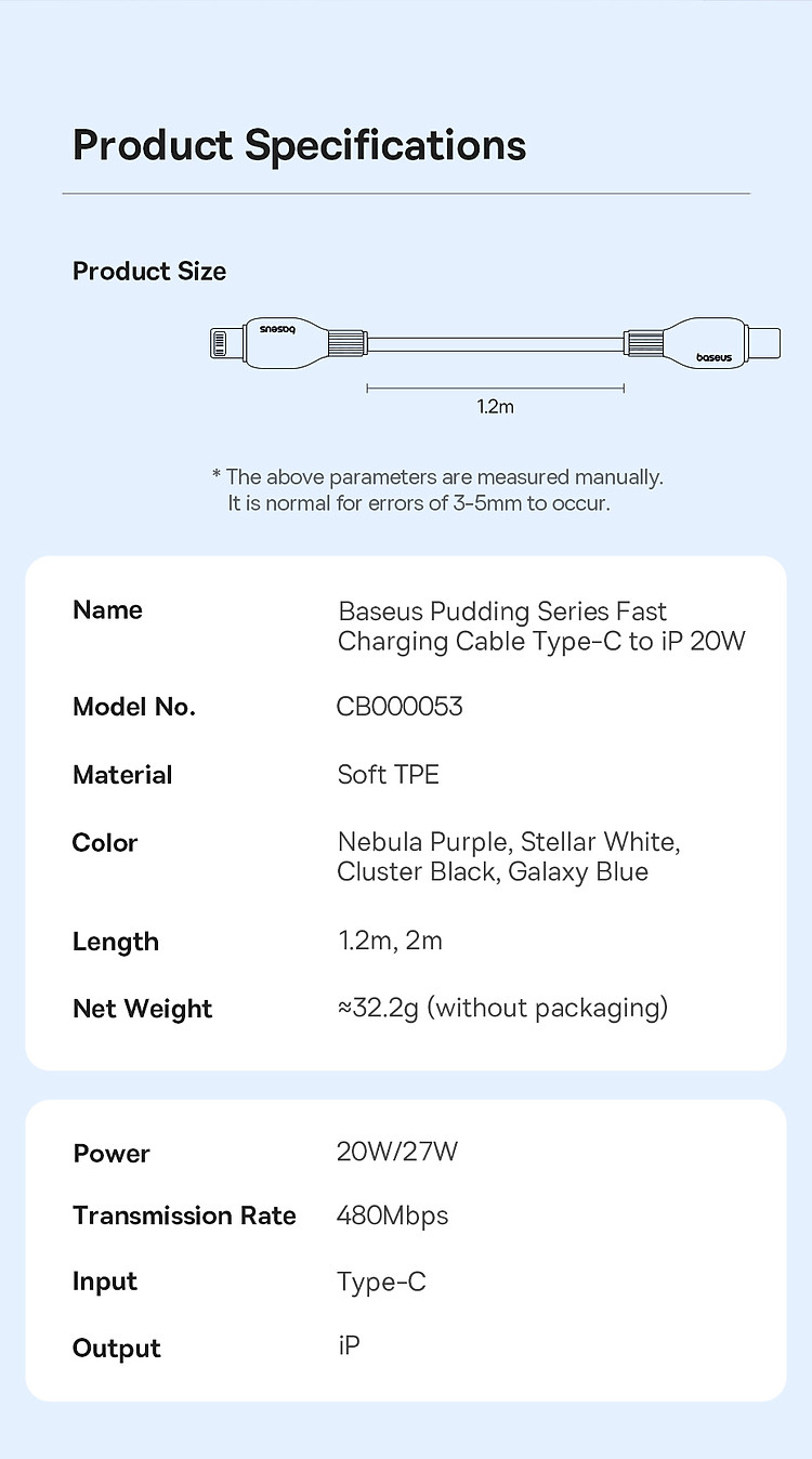 Cáp sạc nhanh Baseus Pudding Series Fast Charging Cable Type-C to iP 20W là một cáp sạc nhanh được thiết kế để sử dụng với các thiết bị của A.p/p.l.e như i.P.h.o.n..e và i,P..a..d. Cáp sử dụng đầu cắm USB-C chuẩn và đầu cắm Ln cho phép sạc nhanh với dòng điện lên đến 20W. Cáp có thiết kế độc đáo với lớp vỏ ngoài được làm bằng chất liệu TPE, cho phép người dùng có thể uốn cong lên đến 20000 lần, với nhiều màu sắc phù hợp với thế hệ Gen Z. Ngoài ra cáp có độ dài 1m, 2m giúp người dùng sử dụng một cách tiện lợi và linh hoạt.