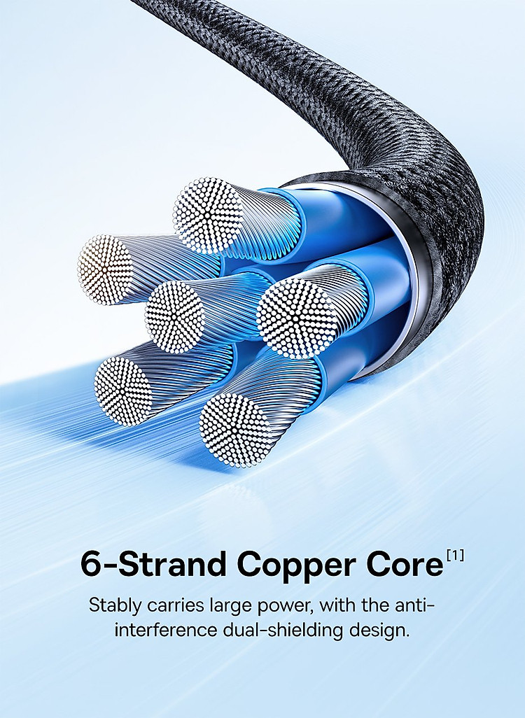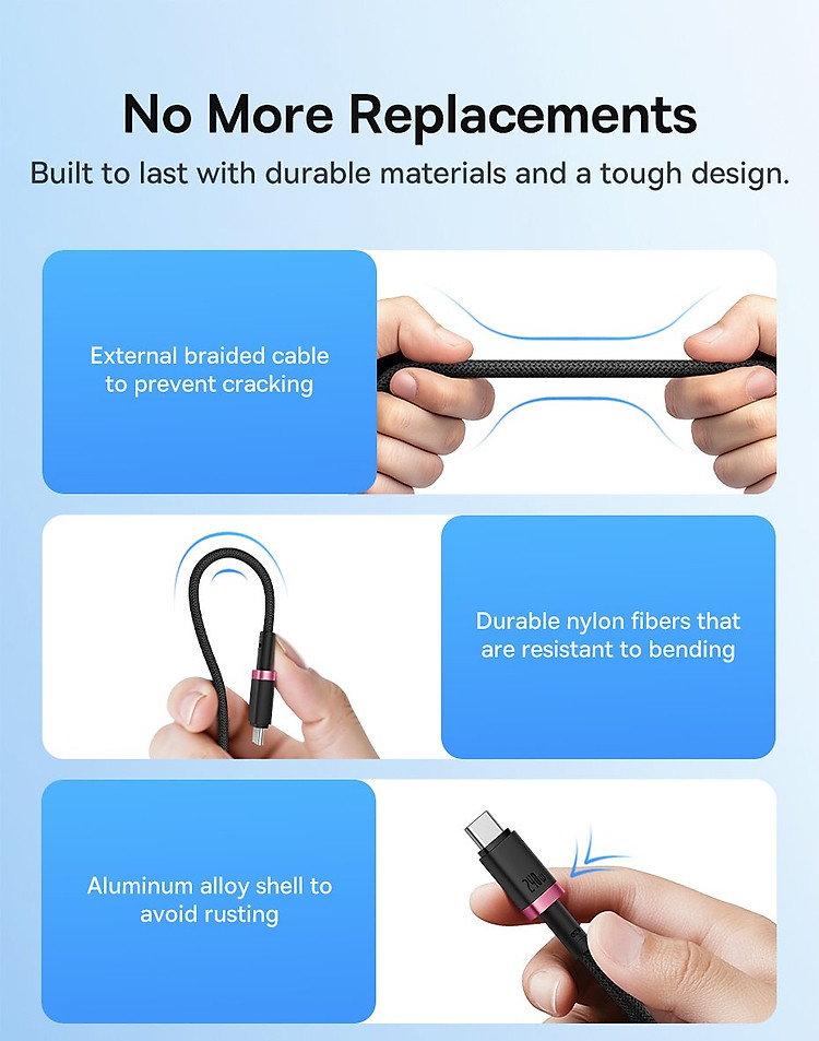 Baseus DURA Series được thiết kế để trường tồn với thời gian. Lõi cáp được làm từ 8 sợi đồng cao cấp, bên ngoài được bao bọc bởi lớp dây bện nylon siêu bền. Thiết kế này không chỉ chống rối, chống đứt gãy hiệu quả mà còn mang lại vẻ ngoài cao cấp. Sản phẩm đã vượt qua hơn 10.000 bài kiểm tra uốn cong nghiêm ngặt, chứng minh cho độ bền bỉ vượt trội.
