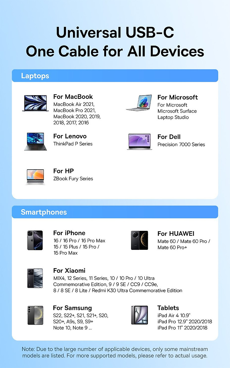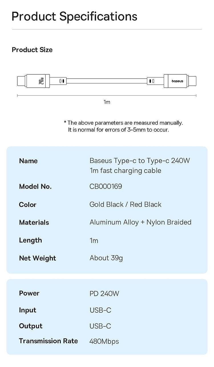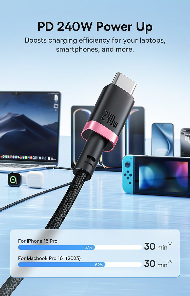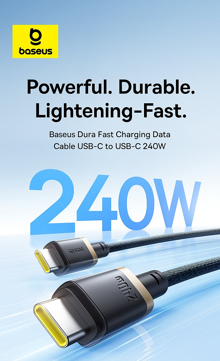 Đây chính là điểm nhấn ấn tượng nhất của Baseus DURA Series. Với công suất sạc tối đa lên đến 240W, chiếc cáp này đáp ứng tiêu chuẩn Power Delivery 3.1 mới nhất, cho phép bạn sạc đầy năng lượng cho cả những thiết bị đòi hỏi công suất cao như MacBook Pro hay laptop gaming một cách nhanh chóng và an toàn tuyệt đối.