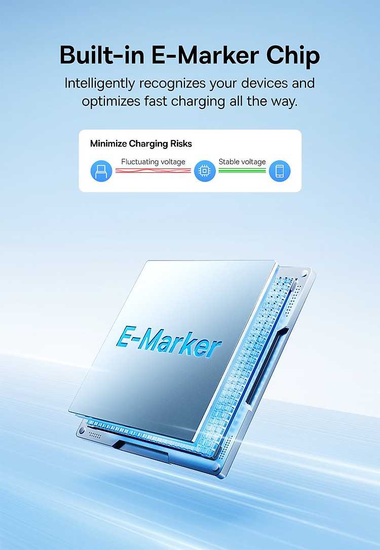 Bên trong đầu cáp là chip E-Marker tiên tiến. Con chip này có nhiệm vụ nhận diện và tự động điều chỉnh công suất sạc phù hợp nhất với từng thiết bị. Nhờ đó, quá trình sạc luôn diễn ra ổn định, an toàn, bảo vệ pin và thiết bị của bạn khỏi nguy cơ quá dòng hay quá nhiệt.