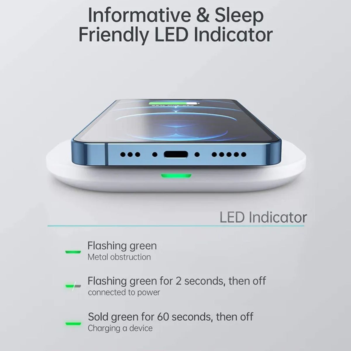 – Bên cạnh thiết kế nhỏ gọn, Choetech T550 còn có thiết kế rất trực quan với đèn LED tích hợp cho bạn biết trạng thái sạc. Đèn LED báo màu xanh lục sẽ nhấp nháy trong 2 giây nếu nguồn điện được kết nối, sau đó sẽ bật trong 60 giây nếu nhận dạng tốt điện thoại hoặc tai nghe của bạn và khi vào chế độ sạc, đèn led sẽ tắt đi.