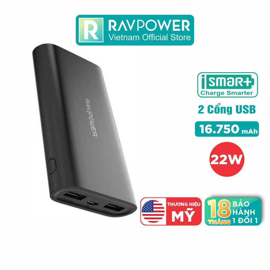 - Pin Sạc Dự Phòng RAVPower RP-PB010 16750mAh là pin dự phòng cao cấp chính hãng RAVPower (USA) dùng cho điện thoai có dung lượng tương đối khủng hiện nay. Với dung lượng lên đến 16750mAh, RP-PB010 sạc đầy iPhone 8 cho 5,5 lần, iPad mini 4 cho 1,9 lần hoặc Galaxy S8 trong 3,2 lần.