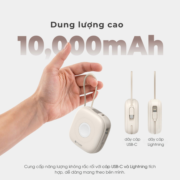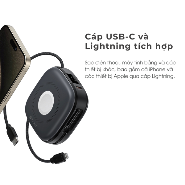 • Cáp tích hợp kép: Cáp Light ning và USB-C cho khả năng sạc nhanh 20W cho iPhone 15 trở lên hoặc bất kỳ thiết bị nào hỗ trợ Light ning.