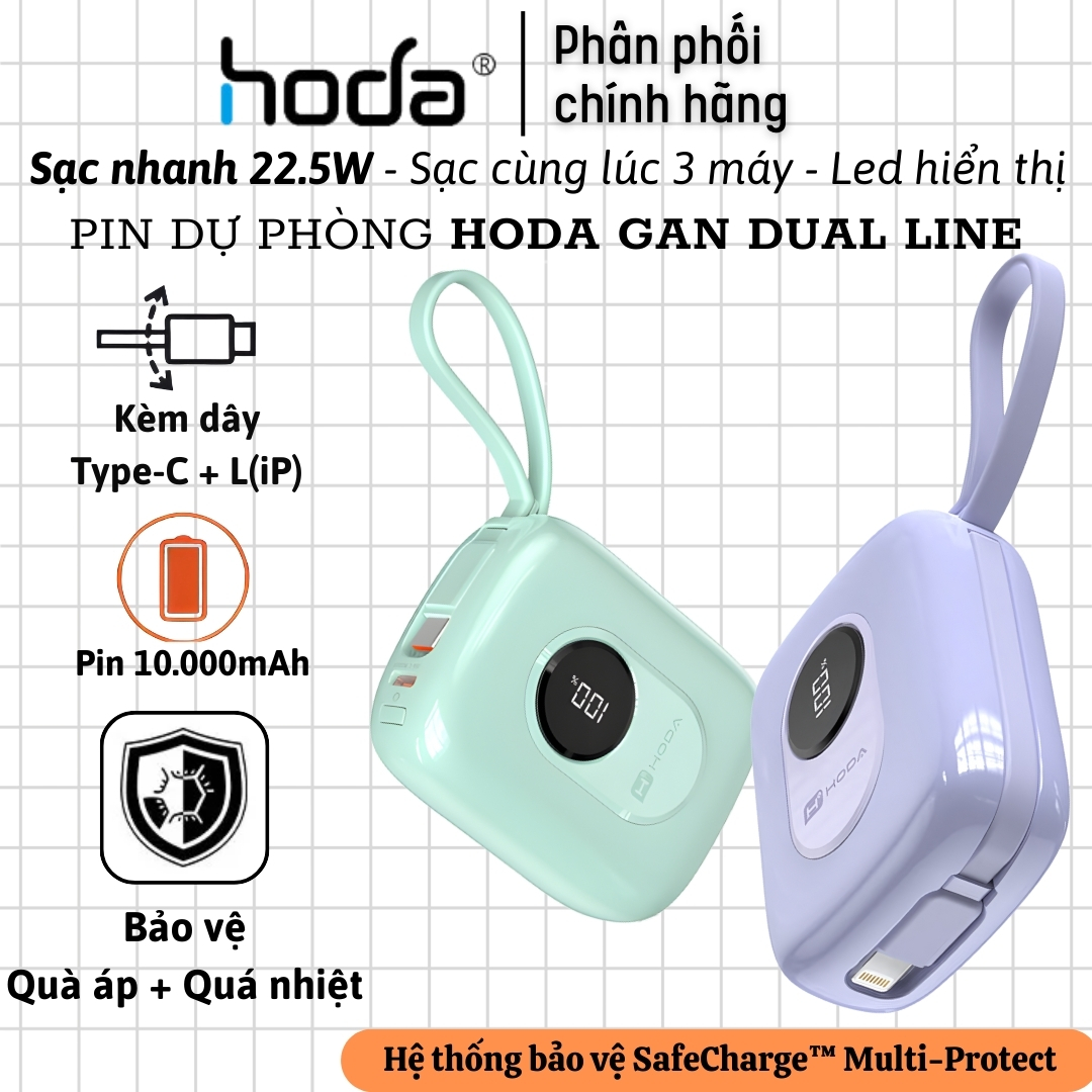 ModelPin Sạc Dự Phòng HODA SafeCharge Multi-Protect 10.000mAh sạc Nhanh PD 22.5W, Tích Hợp Cáp Type-C & L(iP)