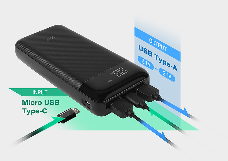 | Lưu ý | Dung lượng: 20.000mAhĐầu vào: Micro-USB: DC 5V/2A ; Type-C: DC 5V/2AĐầu ra: USB1 (USB Type-A): 5V/2.1A, USB2 (USB Type-A): 5V/2.1ALõi pin: Li-PolymerTích hợp nút on/ off |