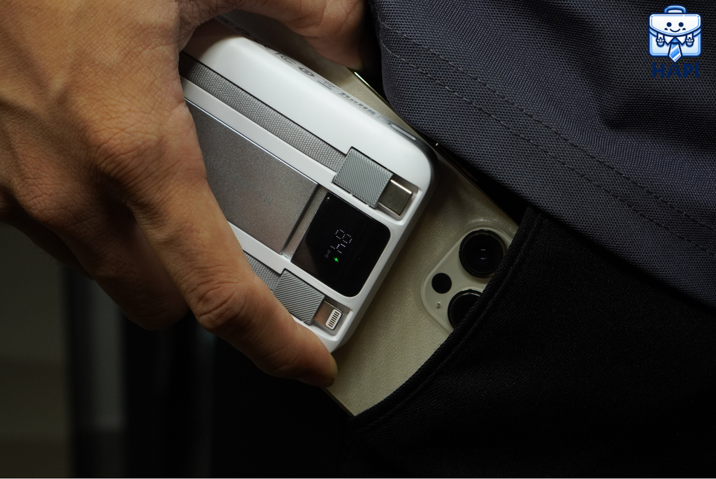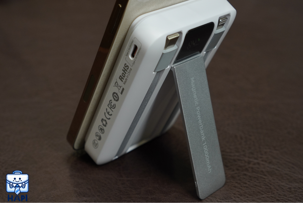 Tích hợp chân kick stand, có thể linh hoạt làm giá đỡ điện thoại khi sạc không dây, hỗ trợ 'magsafe' cho 'iPhone' và có hiện % pin |