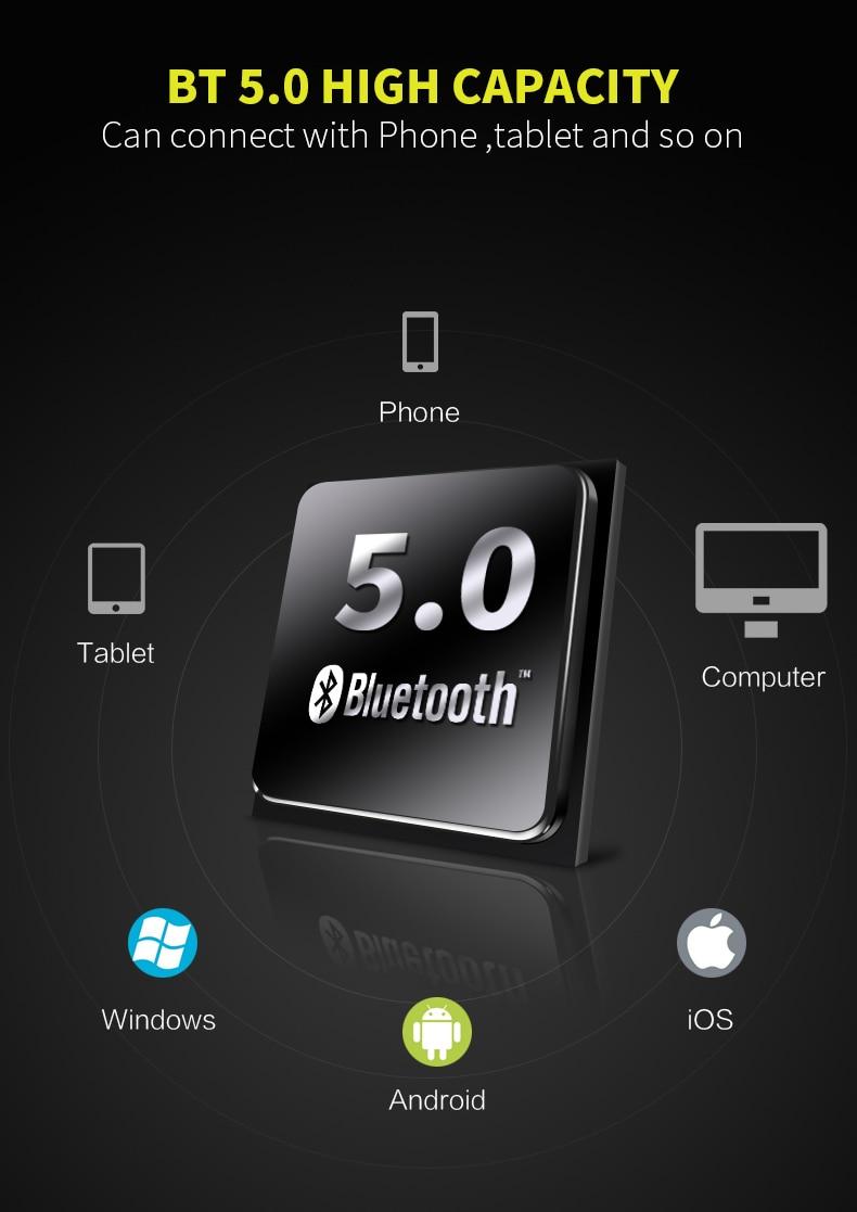 Với công nghệ Bluetooth 5.0, đường truyền ổn định và phạm vi kết nối ổn định hơn. Đồng thời, tai nghe tương thích với IOS, Android, Tablet, Windows.
